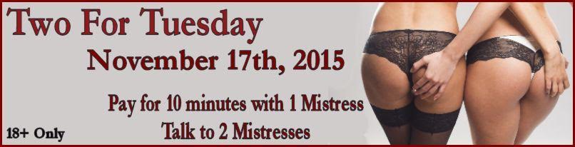 We are continuing our Anniversary Month Celebration with Double the Sexy! On Tuesday November 17th, call anytime between 12:01AM EST and 11:59PM EST and you can talk to 2 Mistresses for the price of 1, for the first 10 minutes of your call!