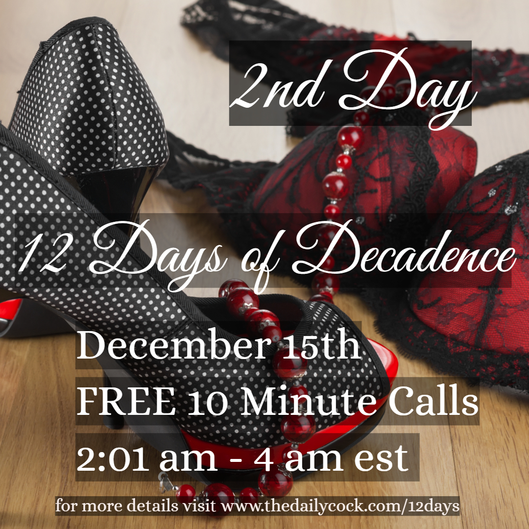 You can be in chastity for ten minutes, stroker slut. You’ll survive it, and you’ll learn to love delayed gratification. Check out the schedule for the rest of the 12 Days, to find the window that best fits your need to touch and stroke and rub, and then give me a call for free phone sex! If you beg just right, maybe I’ll let you cum after all…