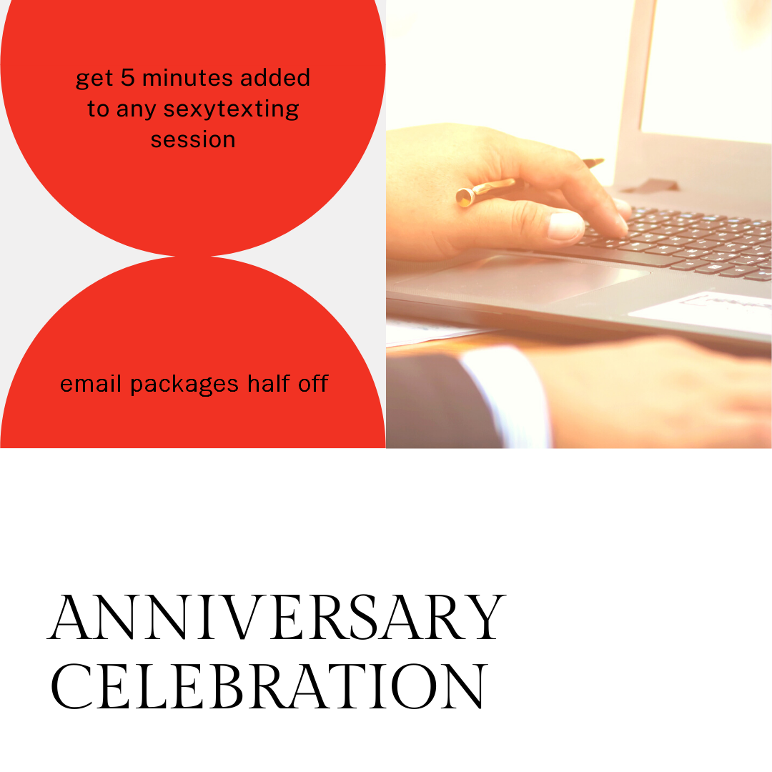 Every sexy texting session with me, whether via skype, discord, or our chatroom, will get five minutes added onto every paid session. Email me to arrange your session, after all, I have to sleep sometime! We’ll get you all set up, and then I’ll toss some bonus sexy time on top. Remember please that all sessions are at least 10 minutes, so you’ll be looking at 15 for the price of 10! You have until April 30, 2022 to take advantage of this offer.